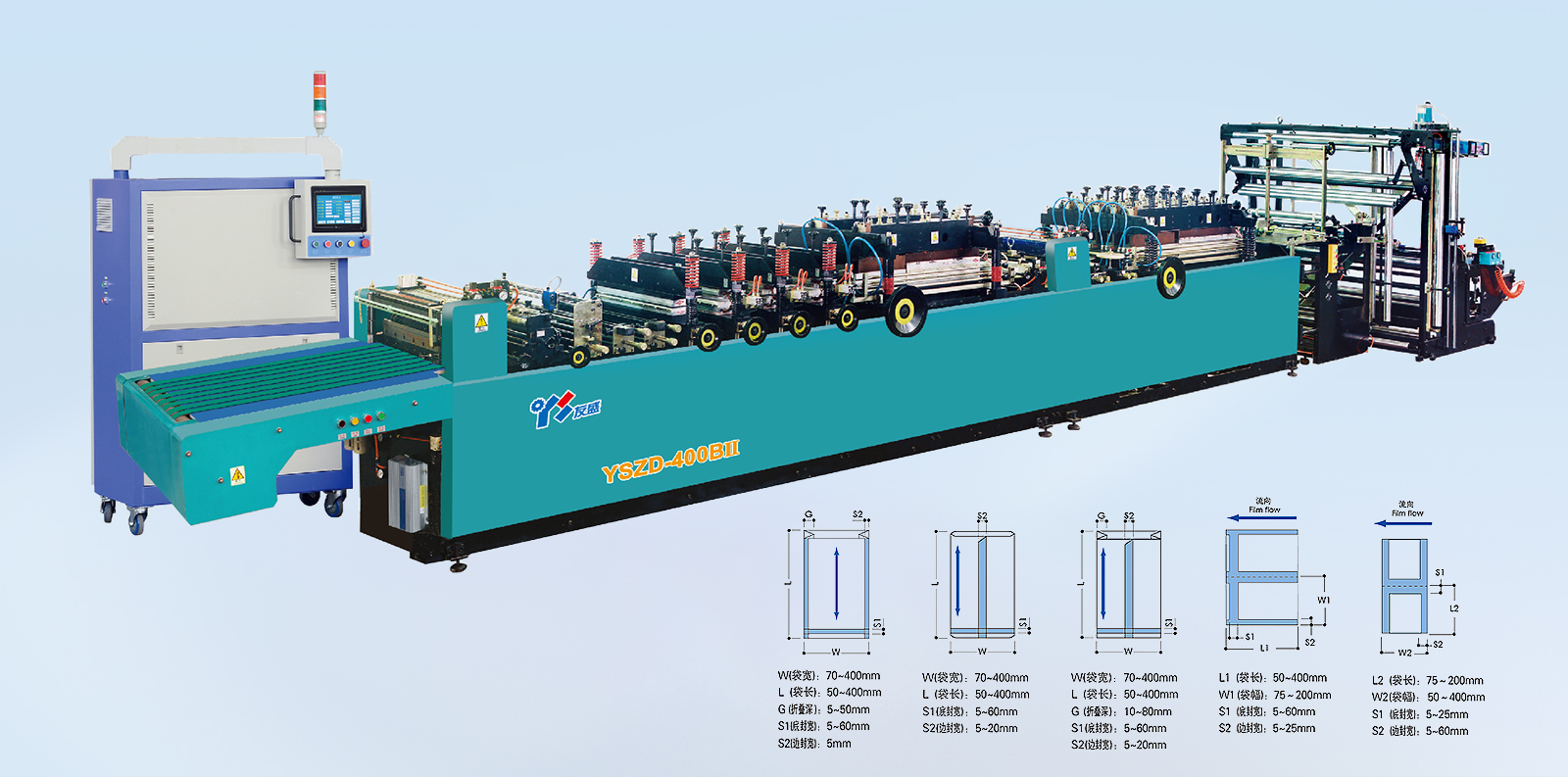 YSZD-400B Ⅱ中封、三邊封、四邊封高速全自動制袋機 YSZD-300/400/500ZF中封、側(cè)封、四邊封高速全自動制袋機 YSZD-500ZF中封、側(cè)封、四邊封高速全自動制袋機 YSZD-500/600/700/800/1000H三邊封高速全自動制袋機 YSZD-600C無接縫站立袋三邊封、站立袋高速全自動制袋機 YSZD-500HK三邊封、站立袋、拉鏈袋、無接縫站立拉鏈袋、儲料架高速全自動制袋機 YSZD-600HB三邊封、站立袋、拉鏈袋高速全自動制袋機 YSZD-600HK三邊封、站立袋、拉鏈袋、無接縫站立拉鏈袋高速全自動制袋機 YSZD-600HK Ⅰ上下圖案跟蹤三邊封、站立袋、拉鏈袋、無接縫站立拉鏈袋高速全自動制袋機 YSZD-600HK Ⅱ CCD視覺定位裁切三邊封、站立袋、拉鏈袋、無接縫站立拉鏈袋高速全自動制袋機 YSZD-800HK三邊封、站立袋、拉鏈袋、無接縫站立拉鏈袋高速全自動制袋機